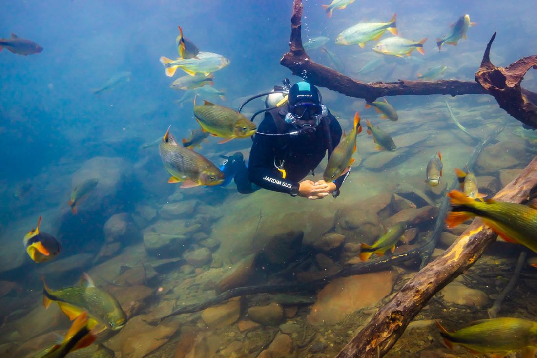 O mergulho com cilindro no atrativo, também localizado em Jardim (45 km de Bonito), ocorre nas águas azuis do Rio da Prata, em profundidades entre 5 e 7 metros, com surpresas a cada instante. É um incrível mundo subaquático de águas cristalinas, repleto de variadas espécies de peixes e vasta vegetação. Feixes de luz, galhadas e troncos caídos, paredões de pedra e formações rochosas compõem a paisagem. Não é preciso ter certificação de mergulho para realizar a atividade.